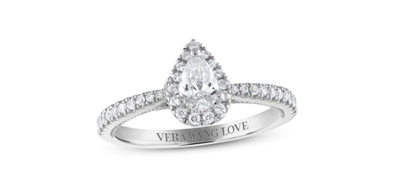 A border of small sparkly gems surrounding a pear center diamond will accentuate the unique shape and protect it from damage.